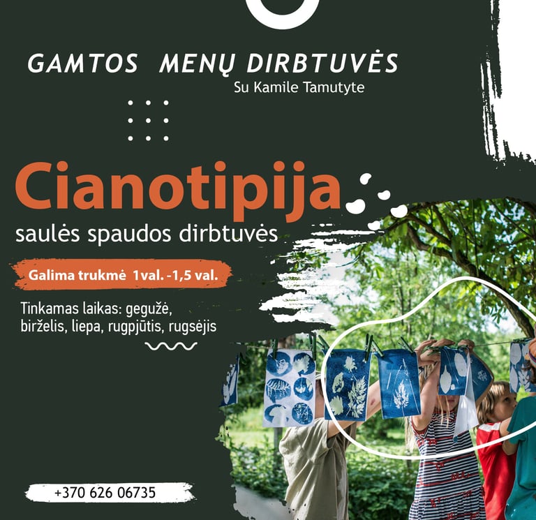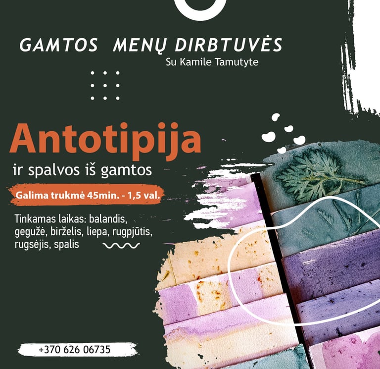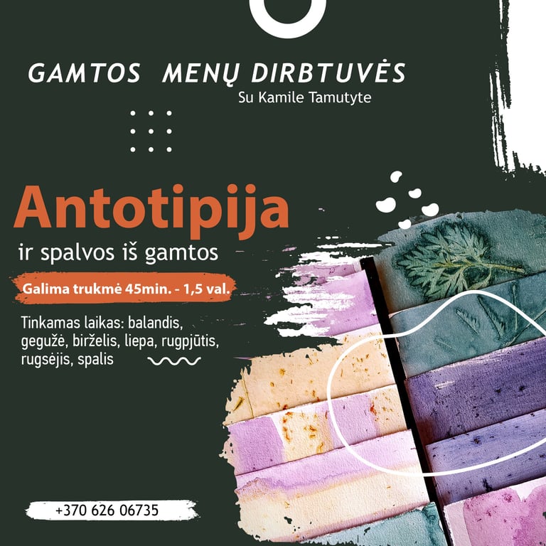 Gamtos menų dirbtuvės - tai mūsų sodyboje Gataučiuose (Joniškio r.) rengiami įvairūs kūrybiniai užsiėmimai, kurie įkvėpti gamtos, sodybos augmenijos ir aplinkos bei nuolatinio poreikio eksperimentuoti ir atrasti. Visi šie užsiėmimai lyg savotiška terapija, nes kūryba su iš aplinkos išgautais natūraliais dažais, augalų atvaizdais, pluoštais ar pačiais augalais - įžemina ir priartina prie natūralumo, tikrumo, prie šaknų, ir prie senovės.